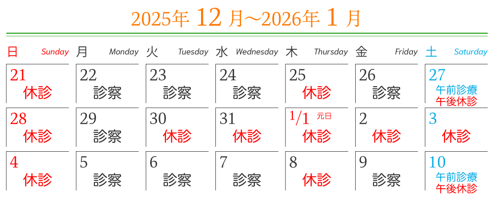 HOME お知らせ 年末年始休診のお知らせ 2025年末は12月29日(月)までは通常通り診療を行います。 12月30日(火)〜1月4日(日)まで休診とさせていただき、1月5日(月)からは通常通り診療となります。 ご不便をおかけいたしますが、よろしくお願いいたします。